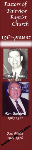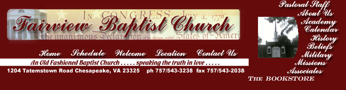 ![]() On June 11, 1961, a handful of believers gathered in a nearby house to establish an independent Baptist churcha place for their families to worship and a presence for the Lord in their community. The little group grew rapidly and relocated from the house to the nearby Norfolk Highlands School, where the infant Church assembled and continued to meet until the church family could build a church-house.After property was purchased one block from the residence where the church first met, the first church-house was erected in 1962 from cement block at 1204 Tatemstown Road in Norfolk County, Virginia (now Chesapeake, Virginia). The years would see the building expand with two additional building projects and a major renovation. The present upgraded facility incorporates the original building, which is still in use daily. Fairview Baptist Church has served the Lord under the leadership of seven pastors since her birth. The first pastor, Rev. Jack White, served from 1961-1962. Successive pastors were Rev. Theodore Bashford (interim 63-66 & 1966-1972), Rev. Rodney Piedot (1973-1975), Rev. Darrell Wood (1975-1980), Rev. David Rulapaugh (1980-1986), Dr. Gary H. McClenney (1986-2004), and Dr. M. Lee Godfrey, serving from 2004 until the present. Like a skillful harbor pilot glides a ship safely past snags and shoals, God used each pastor to guide His local church through uncharted waters to a new point in her life. No two men were the same, no two eras of the Churches course were exactly the same. But every man served faithfully, and every pastor brought the Church to a new point before passing the wheel to the next man of God. Praise the Lord for every pastor who has labored in this ministry. To God be the glory! And we beseech you, brethren, to know them which labour among you, and are over you in the Lord, and admonish you; And to esteem them very highly in love for their works sake. And be at peace among yourselves. --I Thessalonians 5:13 |